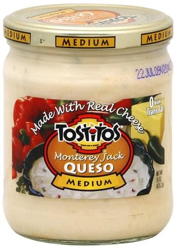 TOSTITOS ® Salsa Con Queso Made with real Monterey Jack cheese, TOSTITOS® Salsa Con Queso blends ripe tomatoes, chopped jalapeños and mild red bell peppers for a medium, creamy dip that always gets the party started. ... Calories: 40: Calories from Fat: 22.5 % Daily Value* Calories 40: Fat 2.5g: 4%: Saturated 1g: 5%: Trans 0g: Cholesterol 5mg: 2%: Sodium 280mg: 12% ...