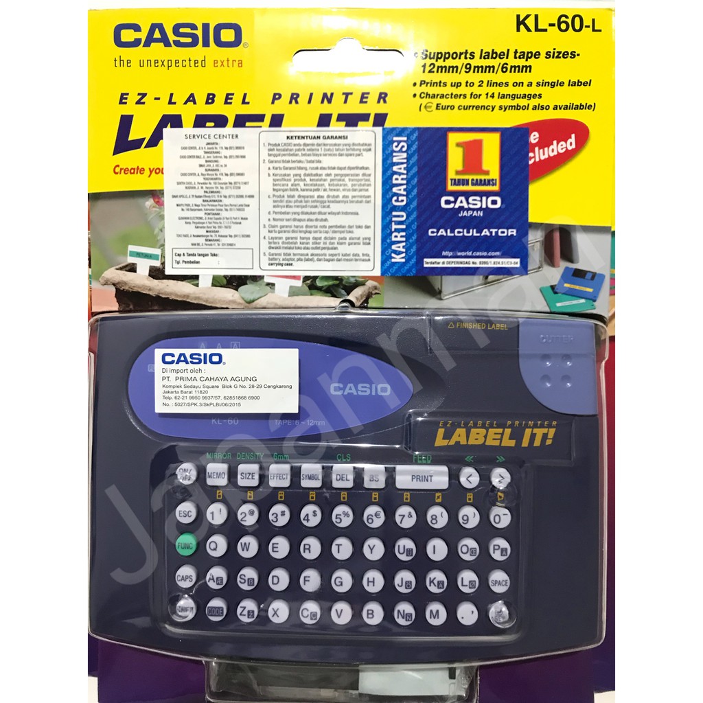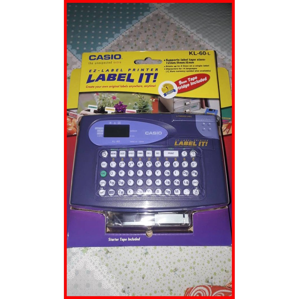 Casio KL-60 Label Printer : Label Makers - amazon.com Easy to use QWERTY keyboard makes creating labels simple and fast. Includes a 4-digit, 1 line, LCD display with one built-in font and 6 character sizes. With a resolution of 160DPI, the KL-60 can print in three sizes (12mm, 9mm and 6mm). 151 Alpha characters, 10 Numbers, 46 Symbols. Prints up to 5mm per second.