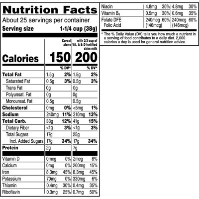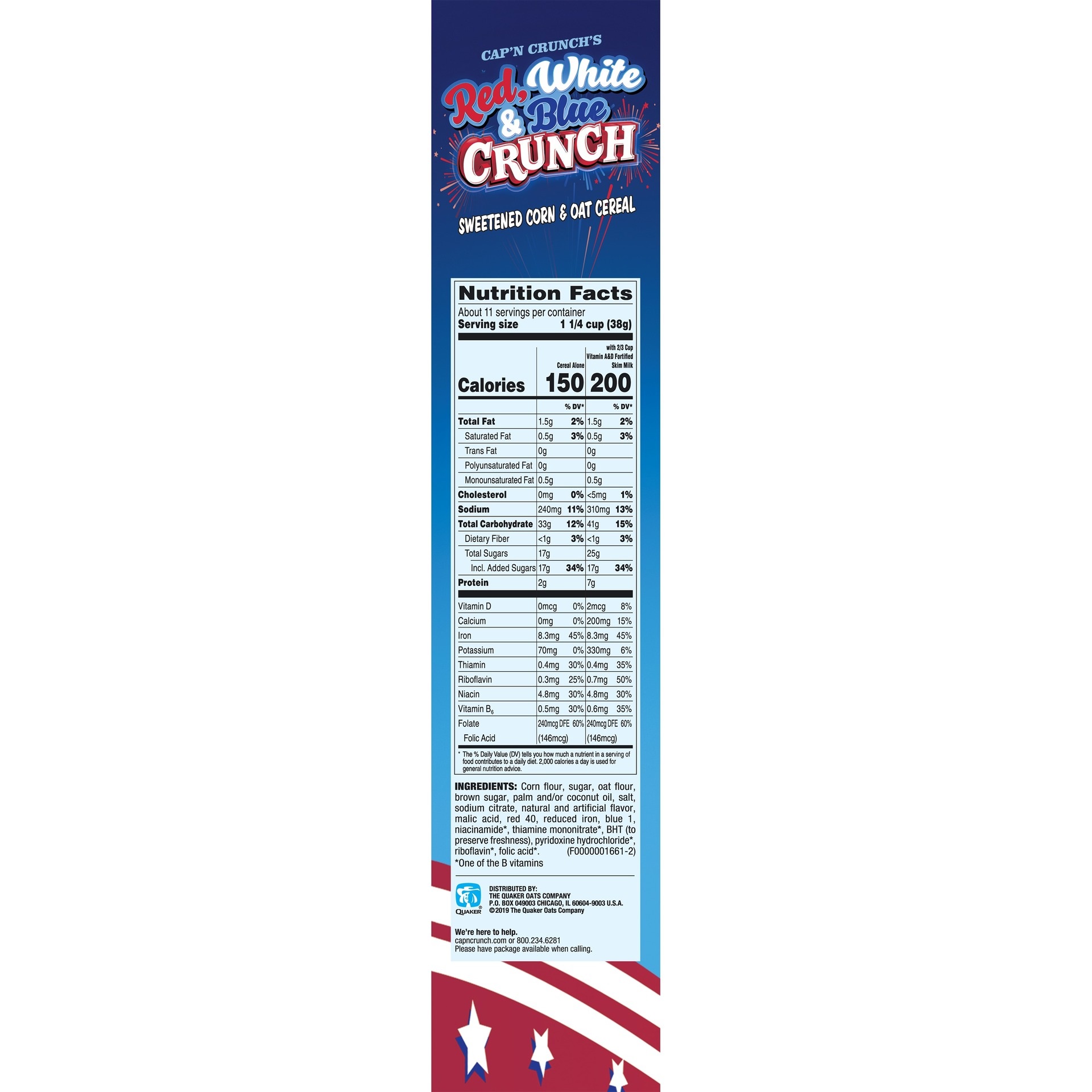 Captain crunch berries nutrition label. Cap'n Crunch's Peanut Butter Crunch® | Cap'n Crunch Description Peanut butter lovers, we've got the crunch for you! Cap'n Crunch's Peanut Butter Crunch ® is loaded with rich and creamy peanut butter flavor and your favorite unmistakable crunch. *Product formulations, packaging and promotions may change. For current information, refer to packaging on store shelves. Nutrition Ingredients Buy Now Cap'n Crunch's Crunch Berries® | Cap'n Crunch Description Rock your taste buds in a berry crunchy way. Cap'n Crunch's Crunch Berries ® take the original crunch you love, and add in bursts of colorful berry flavor. Snag a box and go to town…your mouth will love you for it. *Product formulations, packaging and promotions may change. For current information, refer to packaging on store shelves. Nutrition Label - Allergen Inside Nutrition Label Nutrition Facts Serving Size 1.00 cup Amount Per Serving Calories 130 Calories from Fat 15 % Daily Value* Total Fat 1.5g 2.3% Saturated Fat 0.5g 2.5% Trans Fat 0g Cholesterol 0g 0% Sodium 0.21g 8.75% Potassium 0.06g 1.71% Total Carbohydrates 29g 9.66% Dietary Fiber 1g 4% Sugars 15g Protein 2g Vitamin A 0% Vitamin C 0% Calcium 0% Nutrition Facts for Cap'n Crunch Cereal • MyFoodDiary® Cap'n Crunch Cereal Milk not included Nutrition Facts Serving Size cup 1 cup = 38g Amount Per Serving 150 Calories % Daily Value* 3% Total Fat 2g 3% Saturated Fat 0.5g Trans Fat 0g 0% Cholesterol 0mg 13% Sodium 290mg 11% Total Carbohydrate 33g 2% Dietary Fiber 0.5g Total Sugars 17g 34% Includes 17g Added Sugars Protein 2g 0% Vitamin D 0mcg