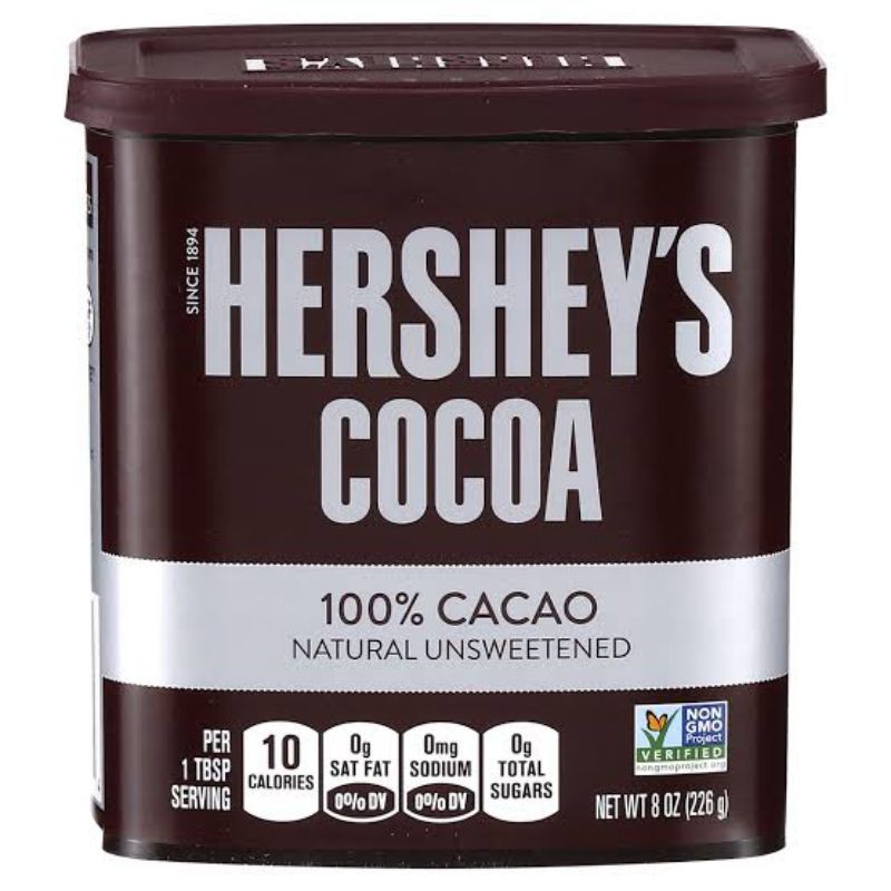 Hershey's Naturally Unsweetened Cocoa Baking Cocoa Container 8 oz. $3.75 ($0.47/oz) Icon details. Product description. Hershey's Naturally Unsweetened Cocoa made of 100% cocao is a staple in every pantry. From pies, cakes, bars and cookies to hot cocoa, brownies, truffles, frosting and waffles, Hershey's Cocoa is ready to help you whip up some amazing chocolaty treats and desserts.