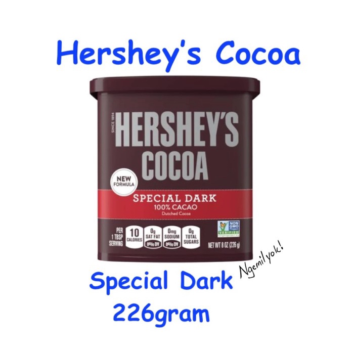 HERSHEY'S SPECIAL DARK - Dark Cocoa - SmartLabel™ Nutrition Facts about 45 servings per container Serving Size 1 tbsp (5g) Amount per serving Calories 10 % Daily Value* Total Fat 0.5g 1% Saturated Fat 0g 0% Trans Fat 0g Cholesterol 0mg 0% Sodium 55mg 2% Total Carbohydrate 3g 1% Dietary Fiber 1g 4% Total Sugars 0g Protein <1g Vitamin D 0iu 0% Calcium 6.9mg 0% Iron 2.1mg 10% Potassium 90mg 3%