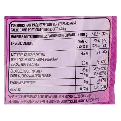 SKITTLES Tropical Sweets Bag 152g | SKITTLES® Nutrition information per portion 38g (%*) Energy 642 kJ (8%) / 152 kcal (8%) Fat 1.6 g (2%) of which saturates 0.9 g (5%) Carbohydrate 34g (13%) of which sugars 28 g (31%) Protein 0 g (0%) Salt <0.01 g (< 1%) *Reference intake of an average adult (8400kJ/2000kcal)