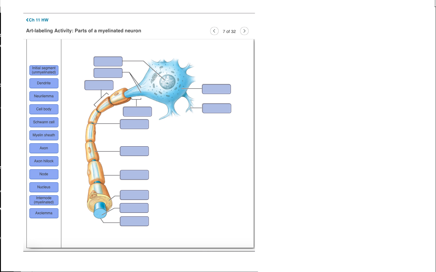 Solved Art-labeling Activity: Parts of a Myelinated | Chegg.com Art-labeling Activity: Parts of a Myelinated Peripheral Nervous System (PNS) Neuron Drag the labels onto the diagram to identify the parts of a myelinated PNS neuron. Reset Help Avon Ilock Nucleos Nodos Donde Initial segment (unmyelinated) Myolinated incomode Axolo Axon Myelin covering internode