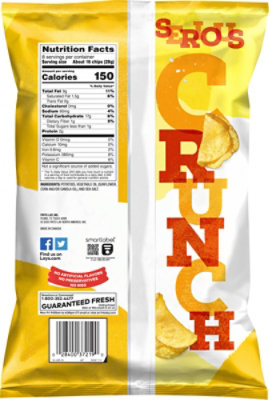 LAY'S® Lightly Salted Potato Chips Nutrition Fact and Amount Daily Value Percentage % Daily Value* Calories 160 Fat 10g 13% Saturated 1.5g 7% Trans 0g Cholesterol 0mg 0%: Sodium 65mg 3%: Carbohydrates 15g 6% Fiber 1g 5%: Sugars less than 1g Protein 2g Vitamin D 0mc 0%: Vitamin C 6%: Calcium 10mg 0%: Iron 0.6mg 2%: Potassium 350mg 6%: Not a significant source of added sugars. Calories in Lay's Original Baked Potato Chips and Nutrition Facts 2g. There are 120 calories in 17 crisps (1 oz) of Lay's Original Baked Potato Chips. Calorie breakdown: 16% fat, 77% carbs, 7% protein. Nutrition Facts for Lay's Baked Original Potato Crisps Lay's Baked Original Potato Crisps Nutrition Facts Serving Size small bag 1 small bag = 1 1/8 oz Amount Per Serving 140 Calories % Daily Value* 6% Total Fat 4g 3% Saturated Fat 0.5g Trans Fat 0g 0% Cholesterol 0mg 8% Sodium 180mg 8% Total Carbohydrate 24g 7% Dietary Fiber 2g Total Sugars 3g 4% Includes 2g Added Sugars Protein 2g 0% Vitamin D 0mcg PDF Oven Baked Lay's® Original Potato Crisps .875 oz. (24.8 g) Frito-Lay Inc. Plano, TX 75024-4099 Ingredients: Dried Potatoes, Corn Starch, Corn Oil, Sugar, Salt, Soy Lecithin, Dextrose, and Annatto Extract (Color). CONTAINS A SOY INGREDIENT. Case UPC 000-28400-33625-3 Bag UPC -28400-04701-2 Case Pack 60/.875 oz. bags Kosher Status No AHG Compliant Yes- E, M, H USDA Competitive Food Compliant