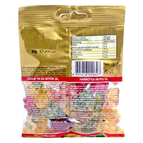 Haribo Goldbears Original Gummy Bears Bag, 4 oz - Walmart.com HARIBO GOLDBEARS® have been the gummy candy gold standard worldwide for over 90 years. Kids and grown-ups love it so, the happy world of HARIBO! Package of 1 4 oz bag. Sweet treats in five fruity flavors: Lemon (yellow), Orange (orange), Pineapple (white), Raspberry (red), Strawberry (green) Fat free gummy bear candy. 100 calories per serving.