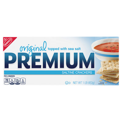 › Premium-Saltine-Crackers-FamilyPremium Saltine Crackers, Family Size, 3 Boxes - amazon.com Three family size boxes of Premium Saltine Crackers with 6 packs per box ; Crisp, square shaped soup crackers topped with sea salt ; Pair salted crackers with soups, stews, and chili ; Top sea salt crackers with peanut butter or cheese for a delicious snack or serve with dips as party crackers ; 70 calories per serving of original saltine crackers