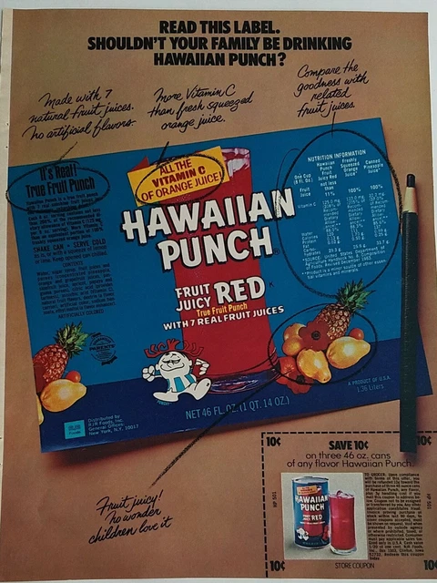 Hawaiian Punch - Fruit Juicy Red can label - 1970's Here's a classic 1970's Hawaiian Punch can label. I drank my fair share of this when I was a kid. Featuring Punchy, a classic 1970's mascot, who is still around today. K Karla 267 followers More information Hawaiian Punch - Fruit Juicy Red can label - 1970's. It's just not the same anymore. They need to make it in the can again. Vintage Food Labels